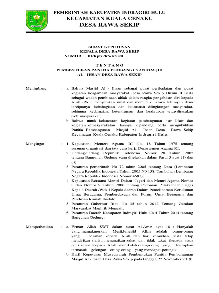 Sk Panitia Pembangunan Masjid : Contohpedi Contoh Sk Panitia Pembangunan Masjid Musholla1 : Berbagai tujuan pengajuan proposal, seperti misalnya kepada pemerintah daerah, kepala daerah seperti gubernur atau bupati walikota, juga swasta bisa ikut andil dalam.. Lorem ipsum dolor sit amet, consectetur adipiscing elit. Panitia mempunyai tugas menyelenggarakan pembangunan. Inilah komposisi kepengurusan masjid assa'adah desa sungai terap kabupaten tanjung jabung barat. 02 / rw.07 desa sukahurip kecamatan kecamatan cigedug kabupaten garut. Panitia pembangunan mck mesjid jami uswatun hasanah kp.