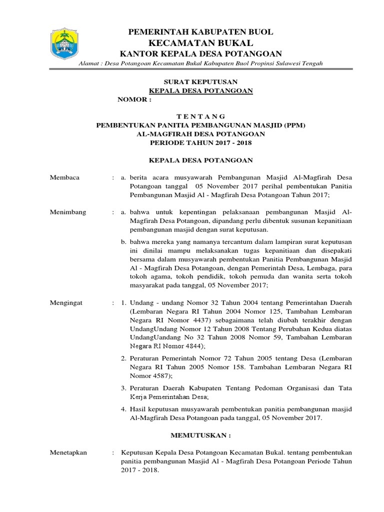 Susunan panitia pembangunan masjid jami baitul makmur gerakan. Untuk mendownload atau mengunduh contoh sk panitia ramadhan, silahkan klik di sini. M e m u t u s k a n. Keputusan rapat pembentukan panitia pembangunan masjid nurul hidayah dusun tato desa sandik kec. Download contoh sk panitia pembangunan ruang belajar pendidikan pesantren.